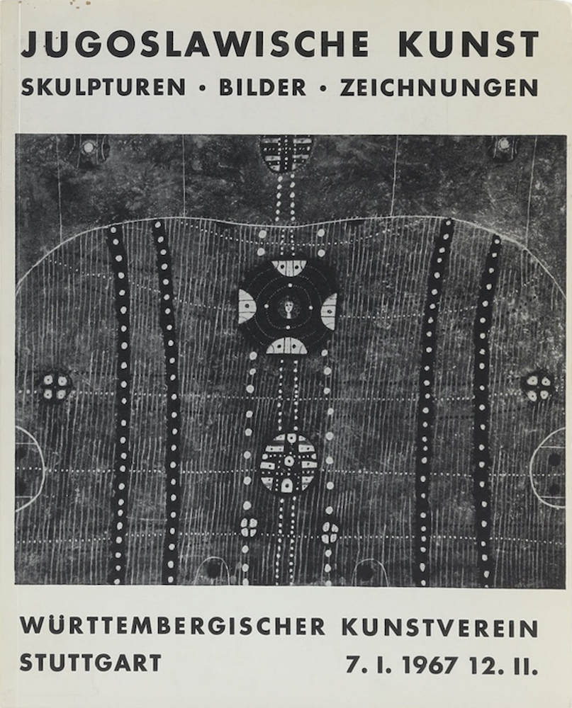 Jugoslawische Kunst. Stuttgart, Württembergischer Kunstverein, 1967. Mit 45 Tafeln u. 2 Abb. 14 n. n. Bl. Kl. 4°. Illustr. OBrosch., diese tls. schwach angerändert u. minimal fleckig. Ausstellungskatalog. Skulpturen, Bilder, Zeichnungen. Mit einem Text von Oto Bihalji-Merin.