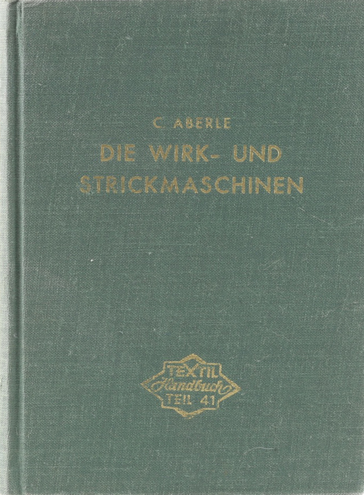 Aberle, Carl. Die Wirk- und Strickmaschinen sowie Press- und Buntmusterberechnungen für Rundwirk- und Rundstrickmaschinen. 1. Aufl. Wuppertal-Barmen, Spohr, (1951). Mit 169, einigen mehrtlg. Illustr. u. Abb. VII, 213 S. (ab S. 203 Anz.) u. 1 w. Bl. Kl. 8°. Goldgepr. OLn. Farbschnitt. Ein Eck berieben, Rücken mit winzigem Defekt. Papierbedingt gebräunt, 1 Anzeigenblatt eingerissen. – Textildruck T 41 aus „Handbuch für Textilingenieure und Textilpraktiker“.