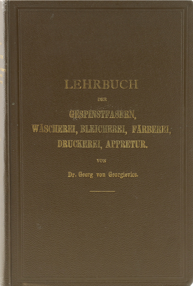 Georgievics, Georg von. Gespinstfasern, Wäscherei, Bleicherei, Färberei, Druckerei, Appretur. Leipzig/Wien, Deuticke, 1898. Mit 47 Illustr. IX, 354 S. 8°. Goldgepr. OLn. Name a. Vorsatz, Vortitel u. Titel, nahezu fleckenfreies Exemplar. (660 Gr.) – Lehrbuch der chemischen Technologie der Gespinstfasern, II.