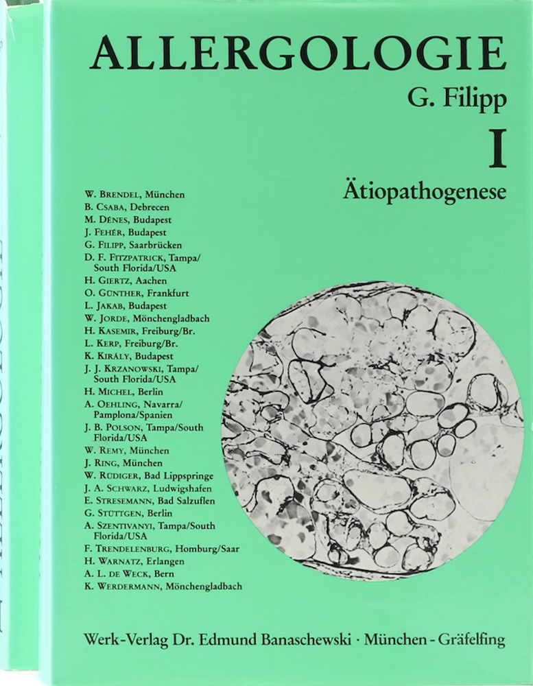 Filipp, G. (Hrsg.). Allergologie. 2 Bände. München-Gräfelfing, Werk, (c 1980). Mit einigen Abb., Illustr., Tabellen u. Diagrammen. XV, 580 S. bzw. IX, 262 S. Gr. 8°. Goldgepr. OLn. Band 1: Ätiopathogenese; Band 2: Therapie.