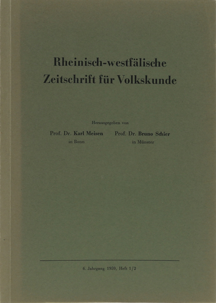 Borchers, Walter. Bäuerlicher Schmuck in Westfalen und im angrenzenden Niedersachsen. Bonn/Münster 1959. Mit 27 Abb. auf 8 Tafeln. S. 69-86. Gr. 8°. OBrosch. Papierbedingt gebräunt. Der obere Schnitt mit kleinem Fleck, im oberen Eck tls. ganz unwesentlich geknickt, sonst gutes Exemplar. (260 Gr.) – IN: Rheinisch-westfälische Zeitschrift für Volkskunde, 6. Jahrgang 1959, Heft 1/2. Weitere Beiträge u. a. über Hausinschriften, Fasnachtsbräuche, Familiennamen u. Totenbücher.