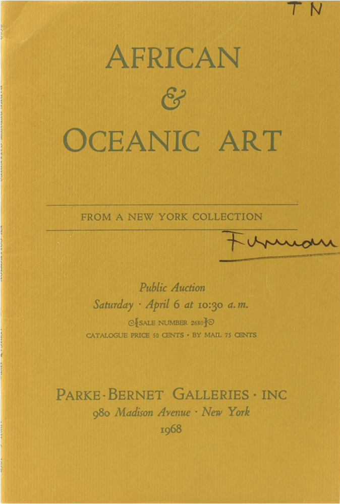 African and Oceanic Art. From a New York Collection. New York, Parke-Bernet Galleries, 1968. Mit 13 Abb. 4 Bl. u. 32 S. Gr. 8°. OU. Der vordere Deckel mit Signatur u. Namenszug. Am oberen Kapital u. unteren Eck durchgehend etwas geknickt. 6 S. mit Anstreichungen bzw. Anmerkungen, sonst gutes Exemplar. (100 Gr.) Auktion 2680.