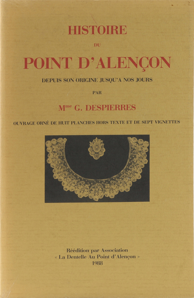 Despierres, G. Histoire du Point d’Alencon depuis son origine jusqu’a nos jours. Alecon, La Dentelle au Point d’Alecon, 1988. Mit 7 Abb. u. 8 Tafeln. 1 w. Bl., 1 Bl., VIII, 175 S. u. 2 Bl. Gr. 8°. Illustr. OBrosch., diese etwas angerändert, betoßen u. weniggeknickt, das obere Eck tls. durchgehend ganz gering geknickt, sonst gutes Exemplar. (350 Gr.)