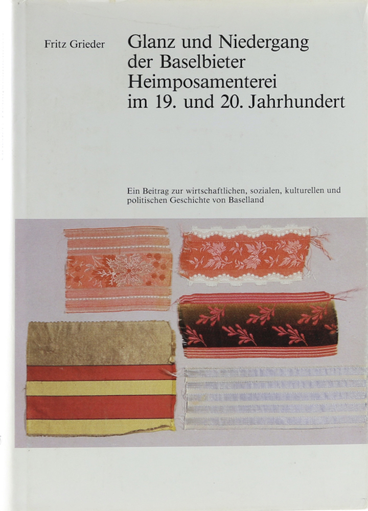 Grieder, Fritz. Glanz und Niedergang der Baselbieter Heimposamenterei im 19. und 20. Jahrhundert. Ein Beitrag zur wirtschaftlichen, sozialen, kulturellen und politischen Geschichte von Baselland. Liestal, Kantonale Schul- und Büromaterialverwaltung, 1985. Mit 1 Grundriß, 3 farb. Abb., 32 Abb. u. Faksimiles, sowie 2 Illustr. 250 S. u. 1 w. Bl. Gr. 8°. OLn. Gutes Exemplar. (590 Gr.) – Quellen und Forschungen zur Geschichte und Landeskunde des Kantons Baselland, 25.