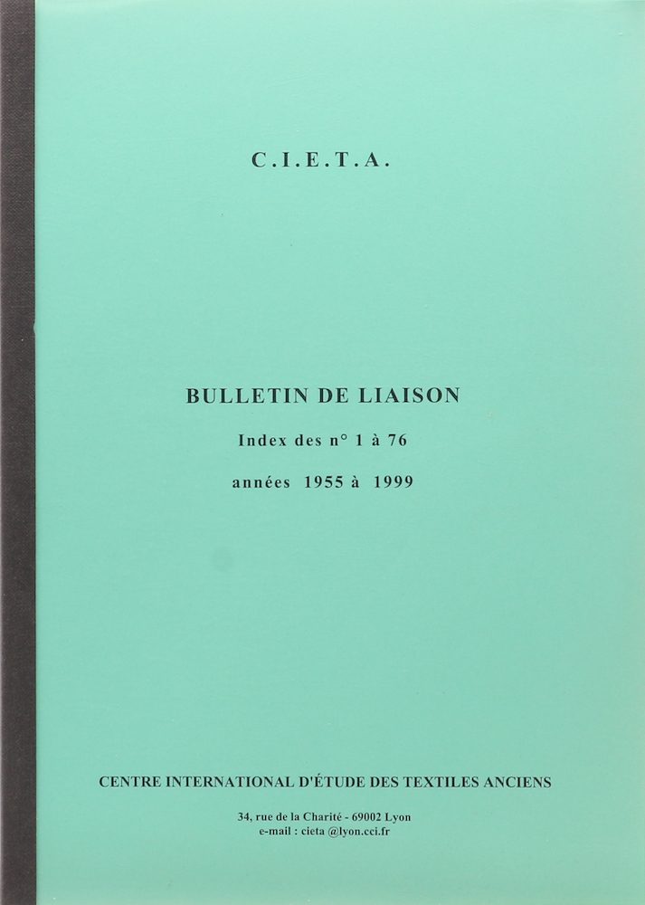 Bulletin de Liaison. Index des n° 1 à 76 années 1955 à 1999. Lyon, Centre International d’Étude des Textiles Anciens, (c 2000). 1 Bl., 121 S. 4°. OBrosch. unter Klarsichtdeckel mit Papierrückenstreifen. Gutes Exemplar. (350 Gr.)