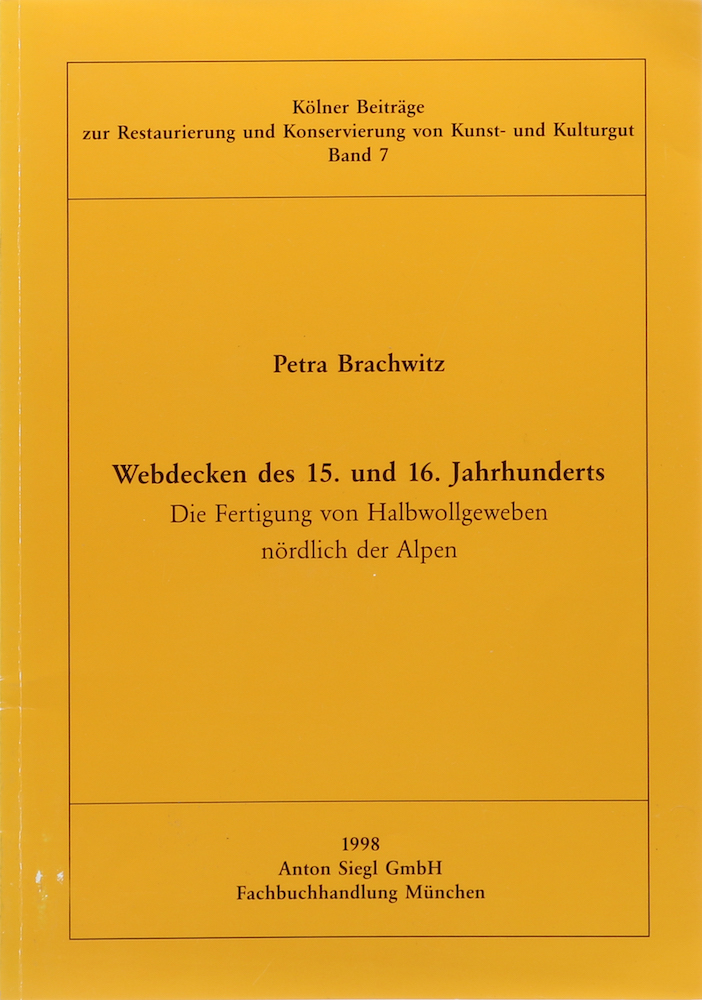 Brachwitz, Petra. Webdecken des 15. und 16. Jahrhunderts. Die Fertigung von Halbwollgeweben nördlich der Alpen. München, Siegl, 1998. Mit 48 Abb., 5 Illustr., 7 Diagrammen u. 2 Tabellen. 78 S., 1 w. Bl. u. 1 lose beigelegtes Bl. (Errata). 4°. OBrosch., diese tls. mit leichten Kratz- u. Knickspuren, sonst gutes Exemplar. (290 Gr.) – Kölner Beiträge zur Restaurierung und Konservierung von Kunst- und Kulturgut, 7.