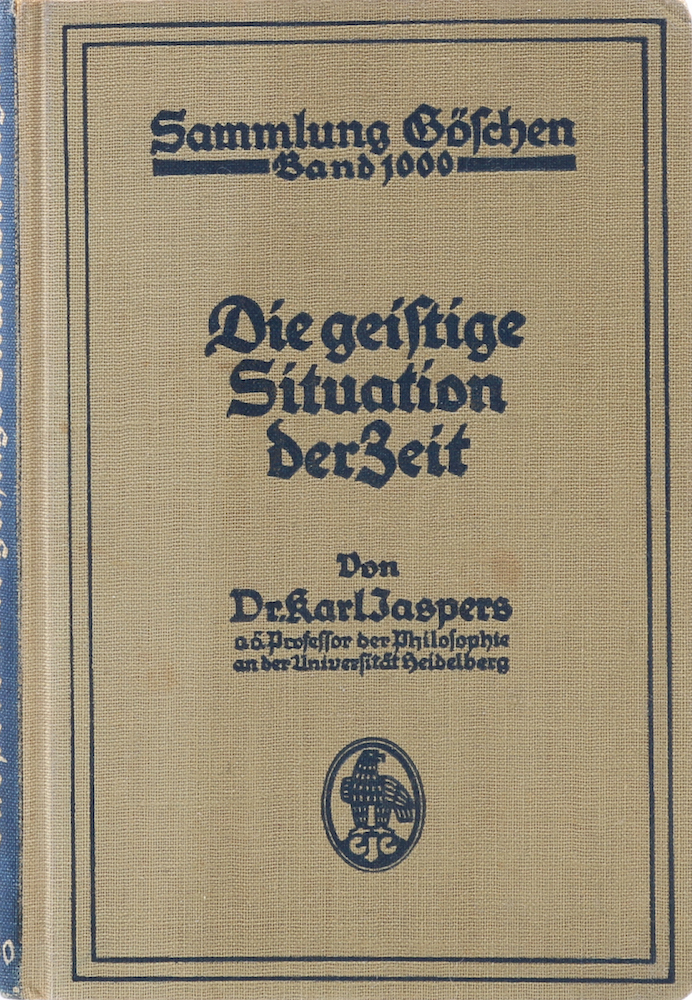 Jaspers, Karl. Die geistige Situation der Zeit. Berlin/Leipzig, de Gruyter, 1931. 191 S. u. 8 Bl. (Anz.). Kl. 8°. OLn., dieses stellenweise ganz gering fleckig. Das obere Eck tls. durchgehend schwach geknickt, gelegentlich gering fleckig u. mit leichten Quetschfalten, d. 1. Blatt im Falz angebrochen. (190 Gr.) – Sammlung Göschen, 1000.