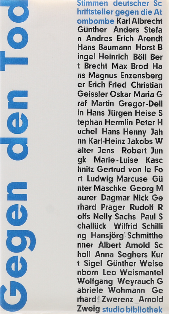 Gegen den Tod. Stimmen deutscher Schriftsteller gegen die Atombombe. Hrsg. u. Vorwort v. Bernward Vesper-Triangel. Redaktion Gudrun Ensslin. Stuttgart-Cannstatt, Studio Neue Literatur, (1964). 1 w. Bl., 1 Bl., 191 S., 4 Bl., 1 w. Bl., 6 Bl. (Anz.) u. 1 Bl. 8°. OBrosch., diese ganz unwesentlich angerändert u. geknickt, sonst gutes Exemplar. (270 Gr.) – Studio Bibliothek, 1. Nr. 65 von 999 Exemplaren.