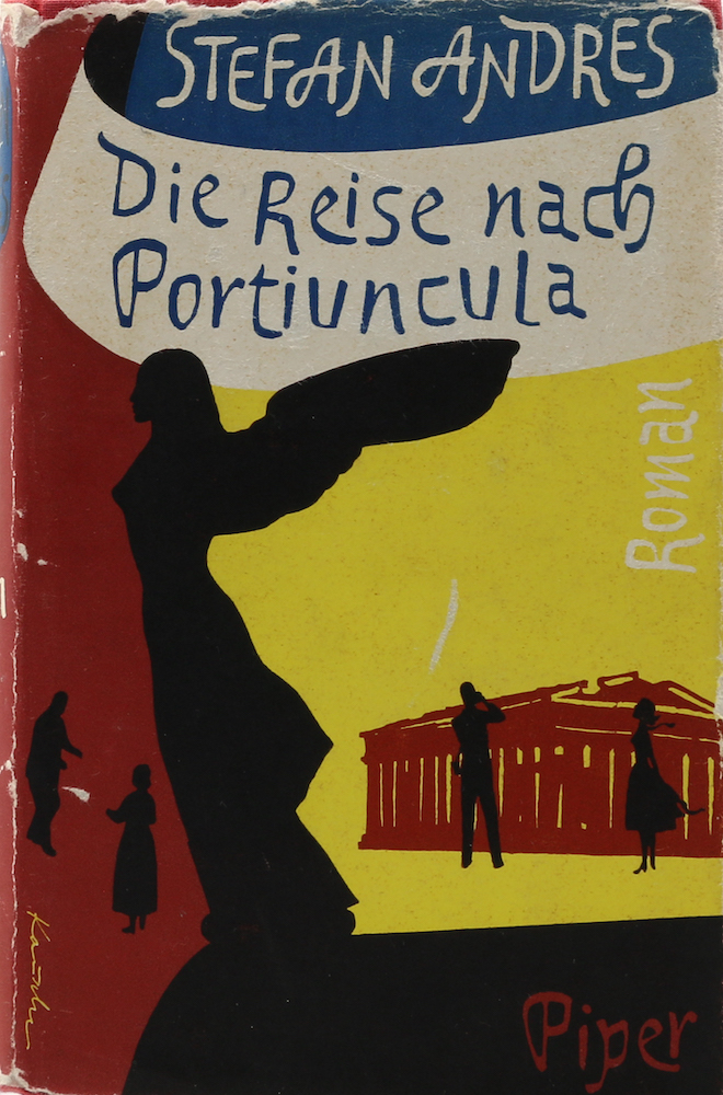 Andres, Stefan. Die Reise nach Portiuncula. Roman. 8.-12. Tsd. München, Piper, 1954. 277 S. u. 3 Bl. (Anz.). 8°. Illustr., goldgepr. OLn., dieses (u. der untere Schnitt) unbedeutend fleckig, schwach berieben u. bestoßen. Besitzvermerk a. d. Vorsatz, papierbedingt gebräunt, 1 Blatt mit Brandloch im weißen Rand. (400 Gr.) Mit handschriftlicher Signatur des Verfassers. Die Ausgabe erschien im Jahr der EA.