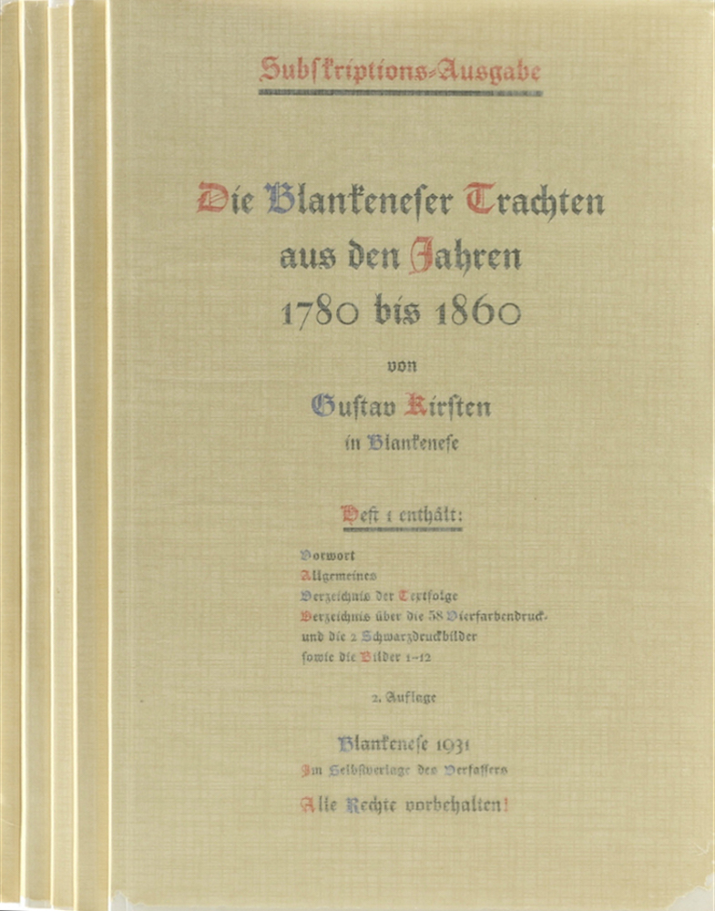 Kirsten, Gustav. Die Blankeneser Trachten aus den Jahren 1780 bis 1860. Heft 1 in 2. Aufl. 5 Hefte. Blankenese, Selbstverlag, 1931/1932. Mit 61 (59 farb.) Abb. auf 60 Tafeln u. 4 Abb. im Text. 66 S. u. 1 Bl. Gr. 8°. OBrosch. Heft 1 im Eck schwach geknickt, sonst gute Exemplare.