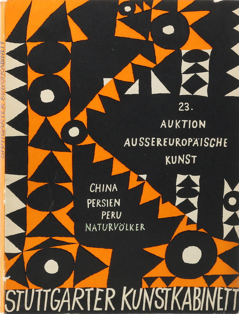 Außer-europäische Kunst. China – Persien – Afrika – Südsee – Peru. Stuttgart, Selbstverlag, 1956. Mit 83 Abb. auf 36 Tafeln. 134 S. u. 1 Bl. 4°. Farb. illustr. OBrosch. Insgesamt etwas fleckig, berieben u. angerändert, die Ecken tls. geknickt. (520 Gr.) – Stuttgarter Kunstkabinett, 23. Auktionskatalog.