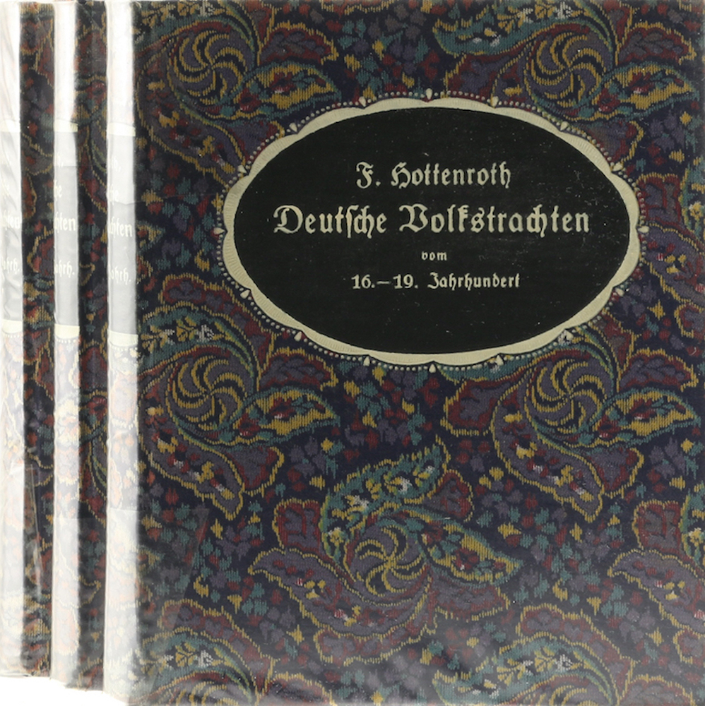 Hottenroth, Friedrich. Deutsche Volkstrachten – städtische und ländliche – vom XVI. Jahrhundert an bis zum Anfange des XIX. Jahrhunderts (bis um die Mitte des XIX. Jahrhunderts (Bände 2 u. 3)). 3 Bände. Frankfurt, Keller, 1898/1900/1902. Mit 144 farb. Tafeln sowie 215 Illustr. u. Schnitten. VII, 233 S.; VIII, 218 S. u. 1 Bl.; IX, 244 S. u. 1 Bl. Farb. gemustertes OLn. mit Deckel- und Rückenprägung. Farbschnitt. Nahezu fleckenfrei. Band 3: An den Kapitalen tls. durchgehend leicht bestoßen, sonst gute Exemplare. Band 1: Volkstrachten aus Süd- und Südwest-Deutschland; Band 2: Volkstrachten aus West- und Nordwest-Deutschland; Band 3: Volkstrachten aus Nord- und Nordost-Deutschland sowie aus Deutsch-Böhmen. Beschrieben werden auch die Trachten aus Elsass-Lothringen, der deutschen Schweiz und den Niederlanden.