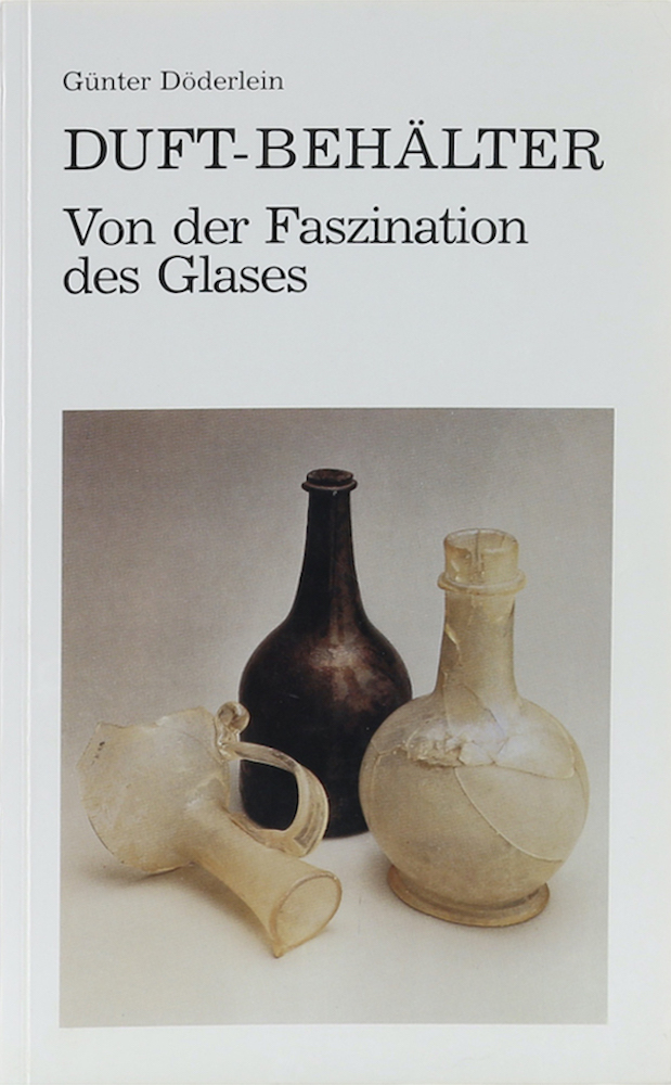 Döderlein, Günter. Duft-Behälter. Von der Faszination des Glases. Tuttlingen, Selbstverlag, um 1985. Mit 11 Illustr. 78 S. u. 1 w. Bl. Farb. illustr. OBrosch. Im Eck tls. durchgehend schwach geknickt, sonst gutes Exemplar.