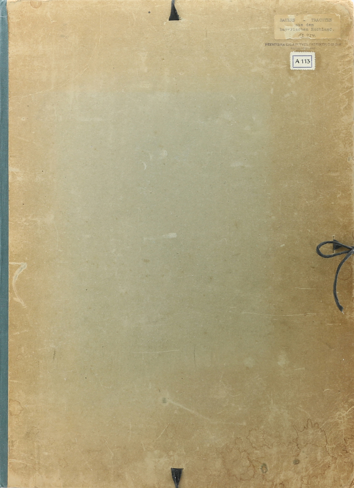Bauern-Trachten aus dem bayerischen Hochland. Hrsg. von Franz Zell. München, Vereinigte Kunstanstalten, 1903. Mit 12 Abb., 1 Illustr. im Text u. 65 (49 farb.) Abb. auf 30 losen Tafeln. 4 lose Blatt. Folio. Schlichte HLnmappe mit Schließbändern (1 defekt). Die Mappe bestoßen, beschabt, gebräunt, tls. fleckig u. mit leichten Kratzspuren, ein Deckel mit 2 montierten Schildern u. einem Stempel (Reemtsma Cigarettenfabriken G.M.B.H. Werbe-Abteilung), der Innendeckel mit dem gleichen Stempel. Der Text im Falz minimal eingerissen, etwas gebräunt u. schwach angerändert, die Tafeln tls. etwas angestaubt, angerändert u. geknickt, vereinzelt mit winzigen Fehlstellen, ansonsten sauber. (1480 Gr.)