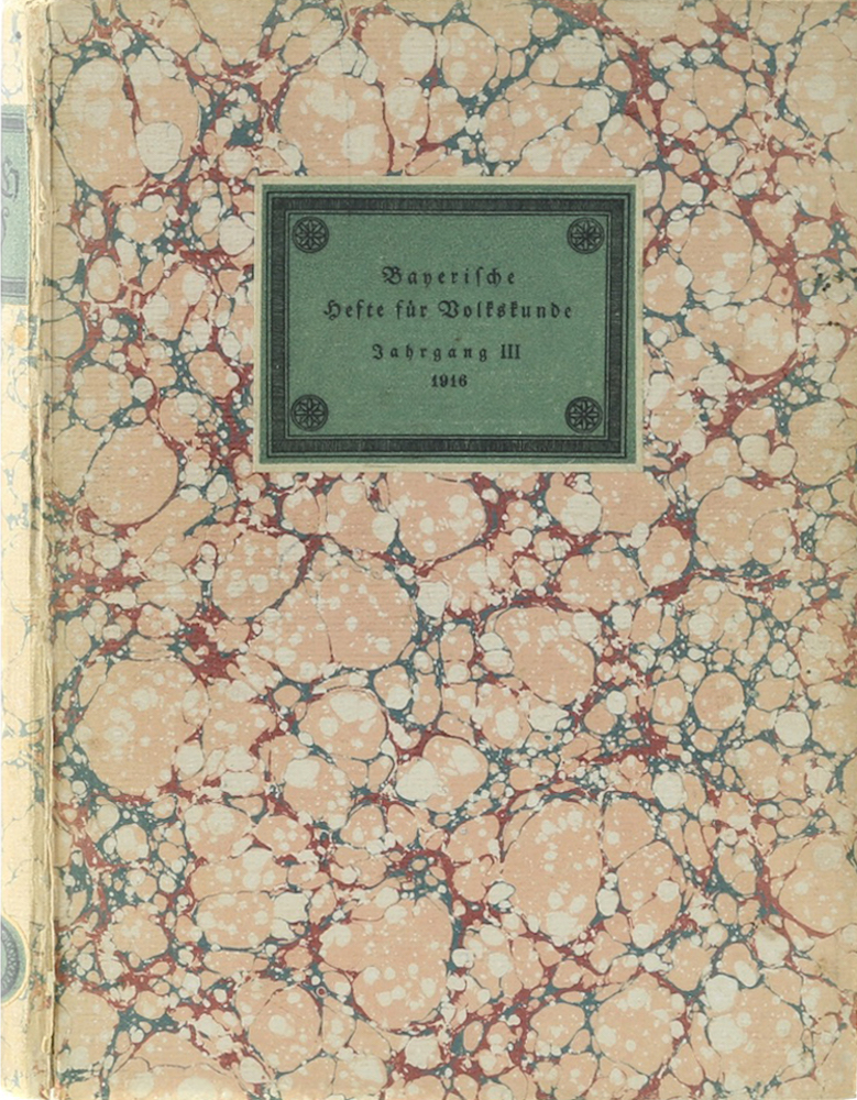 Bayerische Hefte für Volkskunde. Hrsg. v. Bayer. Landesverein f. Heimatschutz – Verein für Volkskunst u. Volkskunde. Jahrgang III. München, Seyfried, 1916. Mit 1 Titelillustr., 79 Abb. u. Illustr., sowie 2 (1 farb.) gefalteten Tafeln. 2 Bl., 266 S. u. 1 Bl. Marmorierter Pbd. mit Deckel- u. 2 Rückenschildern. Einband etwas berieben. Marmorierter Schnitt. Stempel a. d. Vorsatz.
