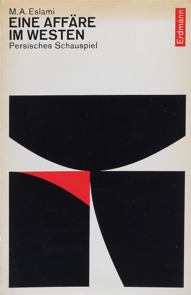 Eslami, Mohammad Ali. Eine Affäre im Westen. Ein Schauspiel in 4 Bildern. Übers. u. eingeleitet v. Rudolf Gelpke. Herrenalb, Erdmann, (c 1964). S. 3-110 u. 1 w. Bl. 8°. Illustr. OBrosch. Die Ränder tls. gebräunt u. im Eck leicht geknickt. Das 1. Blatt entfernt, sonst gutes Exemplar. (140 Gr.)