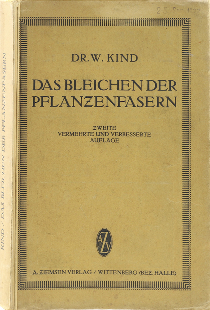 Kind, W. Das Bleichen der Pflanzenfasern. 2., vermehrte Aufl. Wittenberg, Ziemsen, 1922. Mit 67 Abb. u. Illustr., 5 Diagrammen u. 3 Falttafeln mit Grundrissen u. Querschnitten. VIII, 375 S. OBrosch., diese etwas angestaubt, schwach geknickt, angerändert, mit kleinen Randeinrissen u. Stempel. Insgesamt stellenweise etwas fleckig. Stempel a. d. Titel.