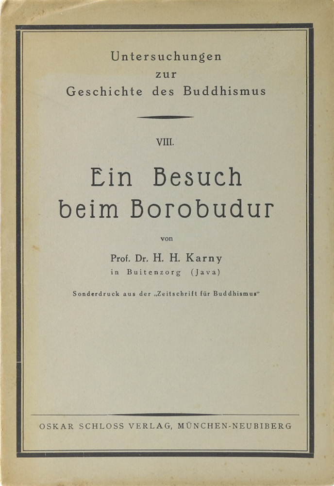 Karny, H. H. Ein Besuch beim Borobudur. München-Neubiberg, Schloss, 1924. Mit 6 Abb. auf 4 Tafeln. 19 S. Gr. 8°. OU. Insgesamt geknickt u. angerändert, der Umschlag gering fleckig und etaws eingerissen. Die Ränder papierbedingt gebräunt. (70 Gr.) – Untersuchungen zur Geschichte des Buddhismus, VIII. (= Sonderabdruck aus „Zeitschrift für Buddhismus“).