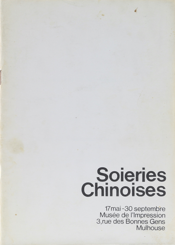 Jaque, Jacqueline. Soieries Chinoises. Mulhouse, Musee de l’Impression sur Etoffes, 1974. Mit 5 Tafeln u. 16 Illustr. 28 S. u. 1 Bl. OU., dieser fleckig u. tls. durchgehend etwas geknickt, sonst gutes Exemplar.