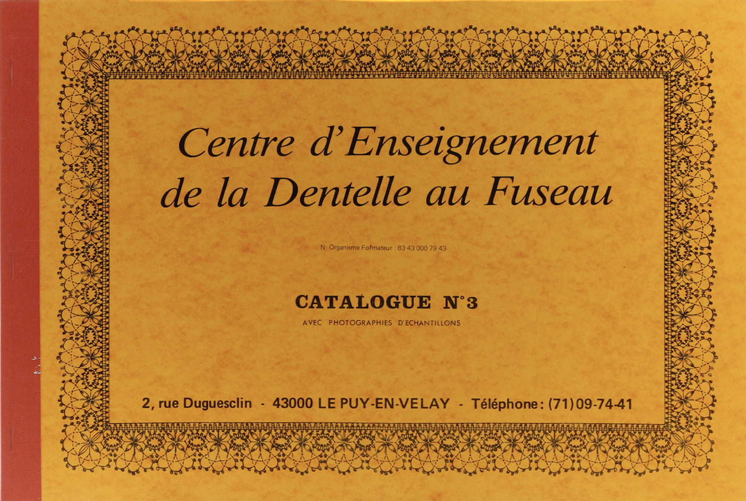 Fouriscot, Mick (Hrsg.). Catalogue No 3 avec Photographies d’Echantillons. Le Puy-en-Velay, Centre d’Initiation à la Dentelle du Puy, o. J. Mit 21 Abb. auf 3 Tafeln u. Klöppelbriefen auf 5 Kartons. Quer Folio. Illustr. OU. mit Papierrückenstreifen. Gutes Exemplar. (340 Gr.) – Centre d’Enseignement de la Dentelle au Fuseau.
