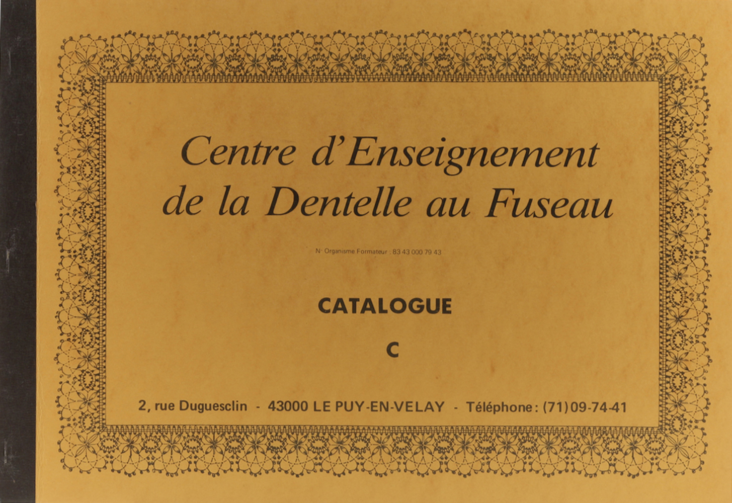 Fouriscot, Mick (Hrsg.). Catalogue C. Le Puy-en-Velay, Centre d’Initiation à la Dentelle du Puy, o. J. Mit 6 Abb. auf 2 Tafeln u. Klöppelbriefen auf 6 Kartons. Quer Folio. Illustr. OU. mit Papierrückenstreifen, dieser etwas defekt. Das letzte Blatt etwas gelöst, sonst gutes Exemplar. (380 Gr.) – Centre d’Enseignement de la Dentelle au Fuseau.