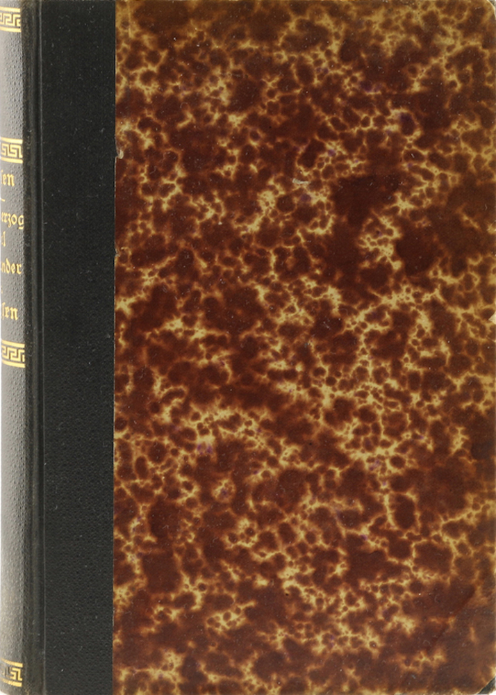 Jansen, Günther (Hrsg.). Großherzog Carl Alexander von Sachsen in seinen Briefen an Frau Fanny Lewald-Stahr (1848-1889). Eingeleitet und herausgegeben von Günther Jansen. Berlin, Paetel, 1904. VIII, 261 S. u. 1 Bl. (Anz.). Kl. 8°. Hln. der Zeit mit Buntpapierbezügen. Der Rücken goldgeprägt. Marmorierter Schnitt, der Kopfschnitt etwas angestaubt. Signatur a. d. Vorsatz, Stempel a. Titel u. 7 Seiten, 1 Blatt mit Randeinriß, sonst gutes Exemplar. (440 Gr.)