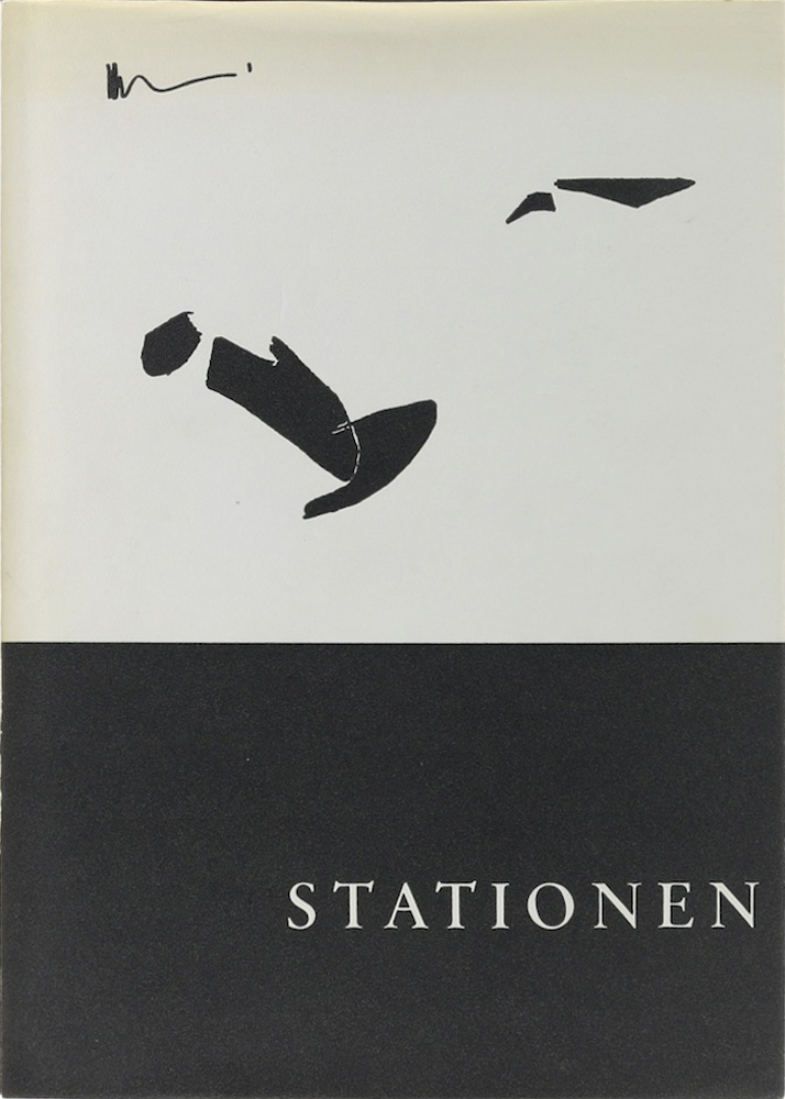 Hirschburger, Kurt. Stationen. Stuttgart, Selbstverlag, 1984. Mit 9 (1 farb.) Abb. bzw. Illustr., 1 Faksimile u. 8 lose beigelegten Tafeln in Lasche. 45 n. n. Bl. 4°. Illustr. OBrosch., diese minimal angerändert u. tls. leicht gebräunt, sonst gutes Exemplar. (780 Gr.) Nummer 116 von 400 Exemplaren. Mit handschriftlicher Signatur und einem beigelegten, maschinenschriftlichen Brief mit großem, illustriertem Briefkopf (wohl an Günther Willmann, einen Redakteur des Süddeutschen Rundfunks), ebenfalls mit handschriftlicher Signatur, sowie 2 angehängten maschinenschriftlichen Blatt mit zwei kurzen Texten (Die heiligen drei Affen; In der Spielbank). Die Beilagen gefaltet.