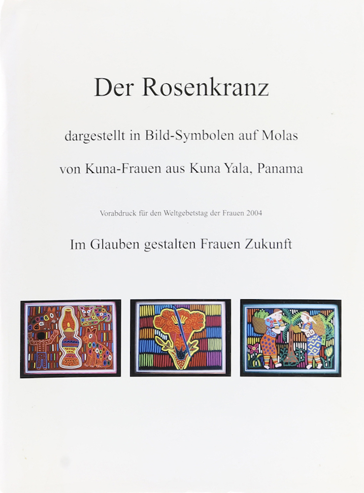 Bauer, Gerhard M. (Redaktion). Der Rosenkranz dargestellt in Bild-Symbolen auf Molas von Kuna-Frauen aus Kuna Yala, Panama. Vorabdruck für den Weltgebetstag der Frauen 2004. 2. Aufl. Essen, Adveniat, 2003. Mit 3 farb. Abb. auf dem ersten Blatt, 15 losen farb. Tafeln. 1 Bl. u. 16 lose Blatt. 4°. Farb. illustr. OHülle, diese ganz unwesentlich geknickt, sonst gutes Exemplar. (280 Gr.)