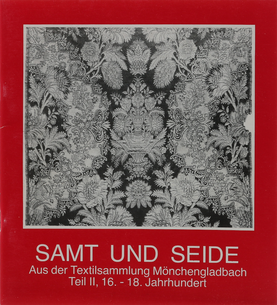Brües, Eva. Samt und Seide. Aus der Textilsammlung Mönchengladbach. Teil II, 16.-18. Jahrhundert. Mönchengladbach, Städtisches Museum, 1985. Mit 15 (4 farb.) Abb. 32 S. 8°. Illustr. OU., dieser minimal berieben. Name a. Titel, sonst gutes Exemplar. (110 Gr.) Ausstellungskatalog.
