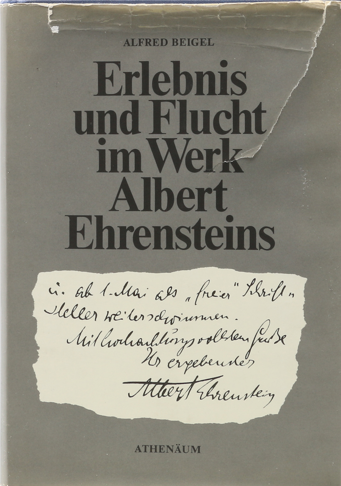 Ehrenstein, Albert. – Beigel, Alfred. Erlebnis und Flucht im Werk Albert Ehrensteins. Frankfurt, Athenäum, (c 1972). 5 n.n. Bl., 131 S. u. 1 Bl. (Anz.). Gr. 8°. OLn. mit goldgepr. Rückentitel. Die ersten Blatt mit kleinem Riß im weißen Rand, der hintere Vorsatz tls. etwas blasig. (370 Gr.) S. 123-131 mit Bibliographie.