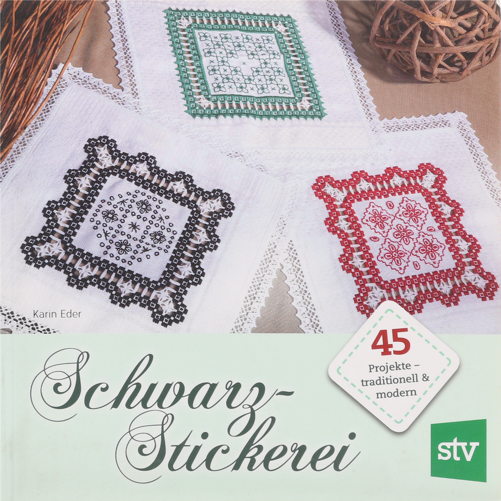 Eder, Karin. Schwarz-Stickerei. 45 Projekte – traditionell & modern. Graz/Stuttgart, Stocker, (c 2020). Mit 28 farb. Abb. u. 28 farb., tls. mehrtlg. Illustr. 60 S. 8°. Farb. illustr. OBrosch. Gutes Exemplar. (200 Gr.)