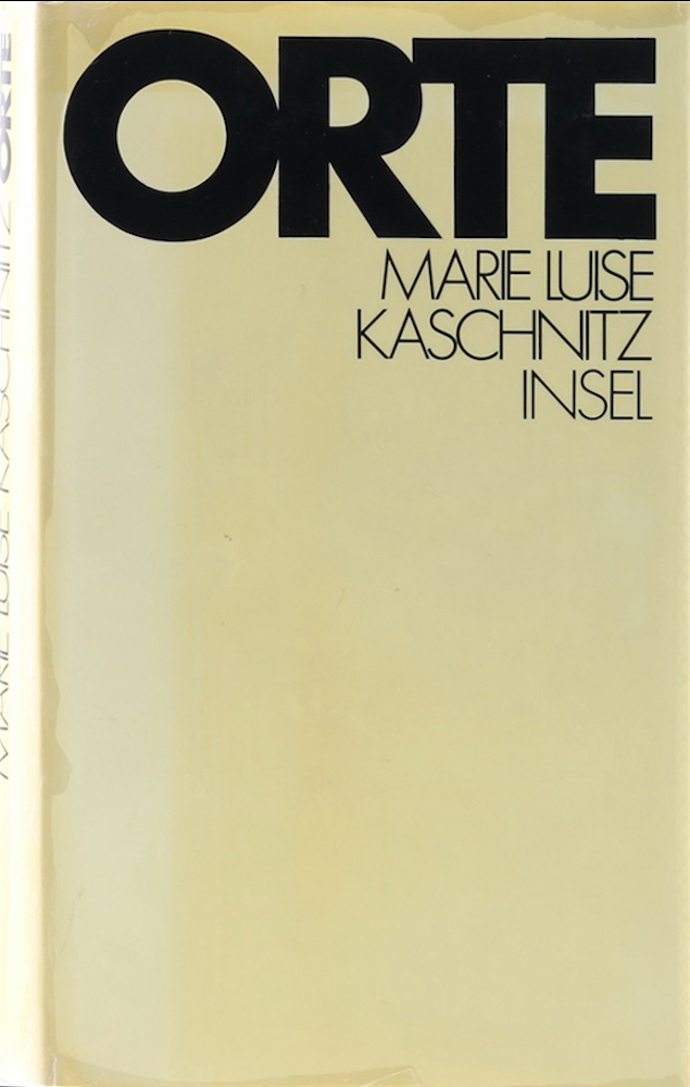 Kaschnitz, Marie Luise. Orte. Aufzeichnungen. 1. Aufl. Frankfurt, Insel, 1973. 244 S., 1 w. Bl. u. 1 Bl. OLn. Am oberen Kapital ganz minimal bestoßen. WG 53.