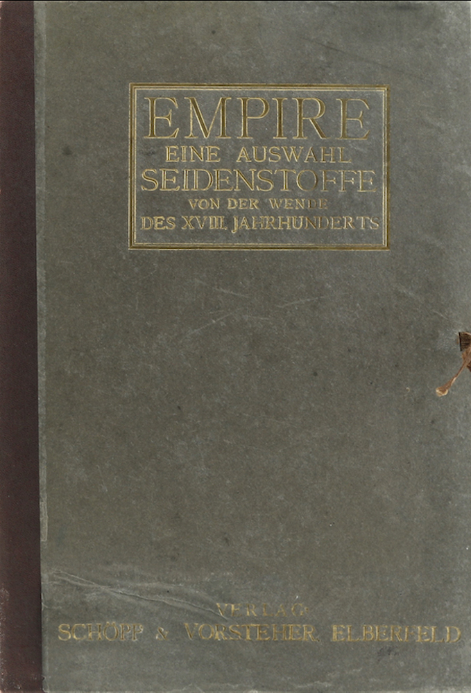 Empire Seidenstoffe von der Wende des XVIII. Jahrhunderts. Elberfeld, Schöpp & Vorsteher, o. J. Mit 53 (4 sich wiederholenden) Abb. auf 15 Tafeln. 1 Bl. Folio. Goldgepr. OHLnmappe, diese tls. bestoßen, berieben u. beschabt, fleckig u. wasserrandig, Bezug stellenweise etwas gelöst. Tafeln tls. gering fleckig u. wenig angerändert.
