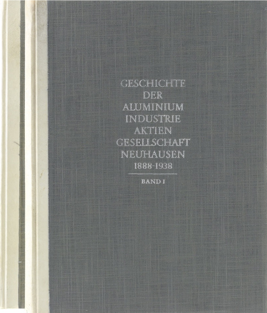 Geschichte der Aluminium-Industrie-Aktien-Gesellschaft Neuhausen 1888-1938. Bd. 2 bearb. v. L. Weisz u. H. Wanner. 2 Bde. Chippis 1942/1943. Mit zus. 3 Karten, 36 (24 farb.) Abb. auf 30 Tafeln, 114 Abb. u. Illustr., sowie 4 (1 farb.) Diagrammen. 227 S., 2 (1 w.) Bl. bzw. 279 S., 1 Bl. 4°. OHPgmt., silbergepr. Pgmt. tls. etwas fleckig, 1 Kapital unbedeutend beschädigt, Deckel etwas aufgebogen. Bd. 1: 2 Bl. im unteren Eck verklebt. Insgesamt gute, nahezu fleckenfreie Exemplare.