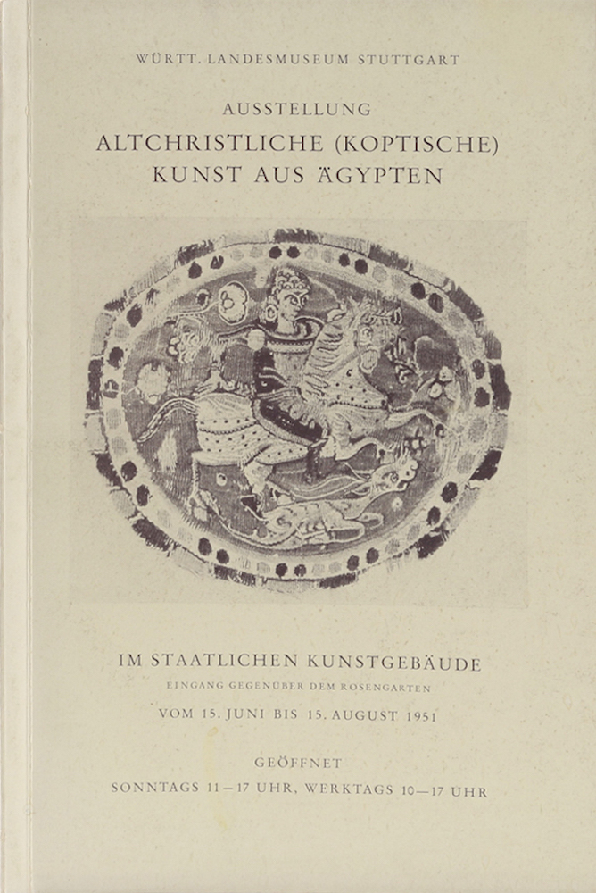Altchristliche (koptische) Kunst aus Ägypten. Text v. Fritz Volbach. Stuttgart, (Württembergisches Landesmuseum), 1951. Mit 7 Abb. 31 S. Gr. 8°. Illustr. OBrosch., diese gering fleckig. Ausstellungskatalog – überwiegend Textilien.